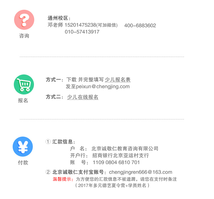 北京诚敬仁暑期德艺少年书法班(第一期7月11日~7月30日,第二期8月5日~8月19日)将给孩子带来多样的艺术滋养,在短短的集训学习中,畅享书法、经典、描红、快乐彩绘、德育动漫、快乐手语舞蹈等德艺教学的乐趣,体会定静生慧的喜悦。