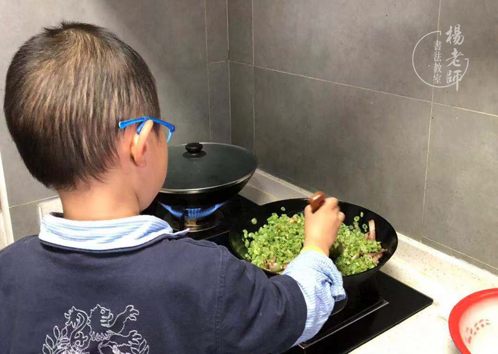 妈妈炒菜时,他也主动要求翻炒几下。