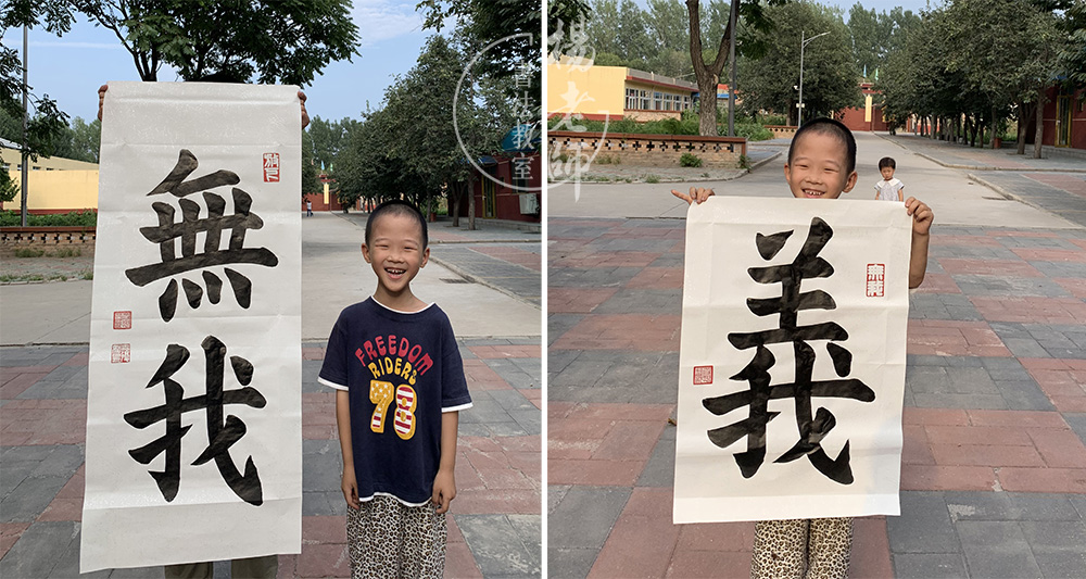 二兜,与姐姐大兜相差7岁。也许出于对中华传统文化的敬意,姐姐7岁时,妈妈把她送去家附近的国画班学习。二兜不到5岁,妈妈就牵着二兜的小手,来到离家十多公里的「杨老师书法教室」。在没来「杨老师书法教室」前,我一直认为,教小朋友学墨的教室,一定是姐姐国画班的样子:墨点甩得天棚四壁到处都是,洗墨池和地面有永远也擦不净的墨迹。可这里,桌椅墙壁雪白,水槽干干净净,笔墨纸砚整洁规矩,井然有序。没有华丽的陈设,朴素的铁丝上报纸齐整串连着一张张元气满满的书法大字,让人不得不凑上前去仔细端详:不看不知道,简直无法相信这些端正粗壮笔划的大字,竟是出于学龄前的小朋友之手。赞叹中,忽闻小朋友向老师行上课礼。学生谦恭有礼,老师和善坚定。于是令人肃然起敬,决定退掉争抢而来的公立幼儿园名额,让二兜留在这里学习。